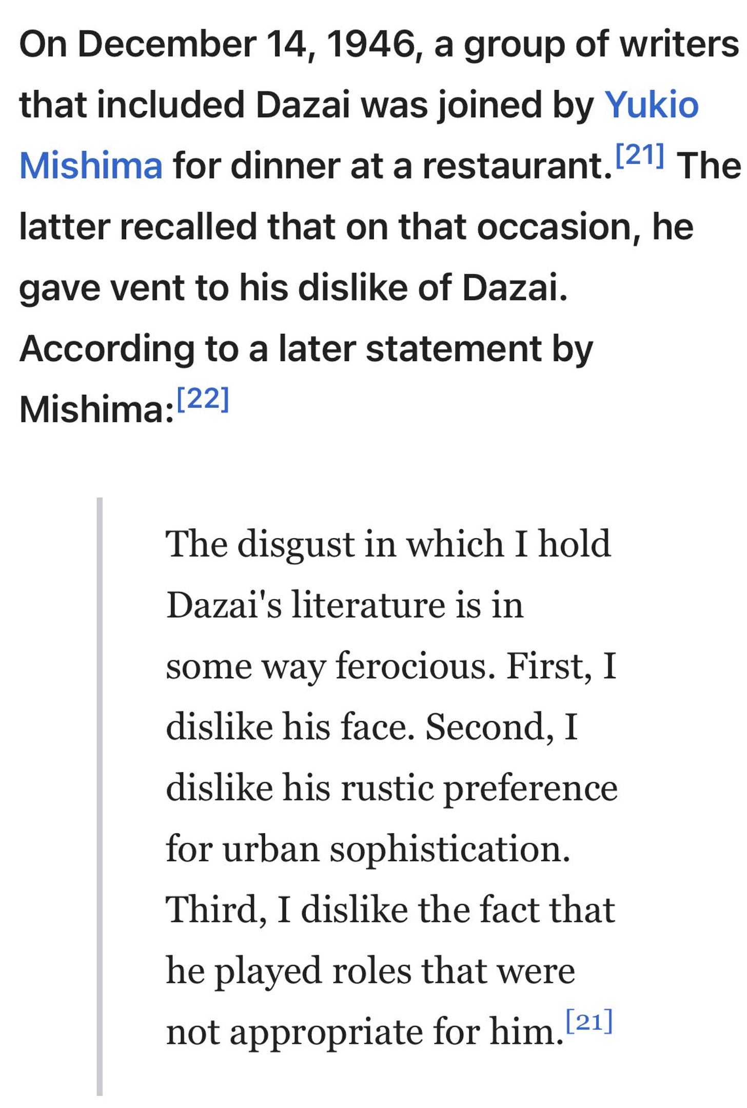 In fact, Mishima wasn’t the only person who took issue with Dazai’s style at the time. He was quite controversial among his contemporaries.